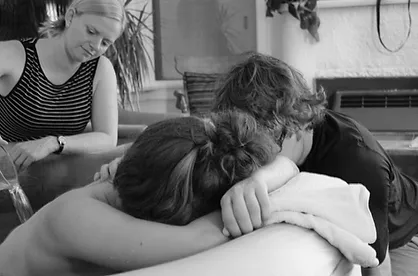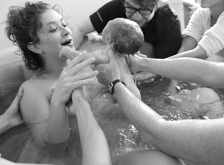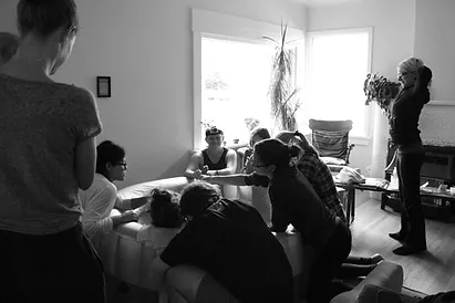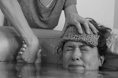 I recall one very strong pressure wave while I was transferring to the birth tub and I felt my body push! This is when I first allowed myself to believe I was having my baby! I forget exactly who called whom, but my support team started to assemble once I was in the pool. Shalom was the first to arrive and immediately started applying cold wash clothes to my forehead and neck. It felt wonderful! My doula Ricky arrived shortly thereafter and over the next several hours all my other girlfriends Ashley, Thirza and Lauren arrived.