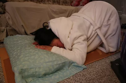 7 AM: Ricky arrived. I was listening to “Easy First Stage” Hypnobabies track, resting on the ball.