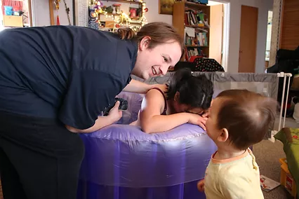 My midwife talked about the possibility of me getting out of the water to push since she wasn’t seeing as much progress as she would like. My toddler started being a cheerleader at this point, “Baby, baby, baby!”